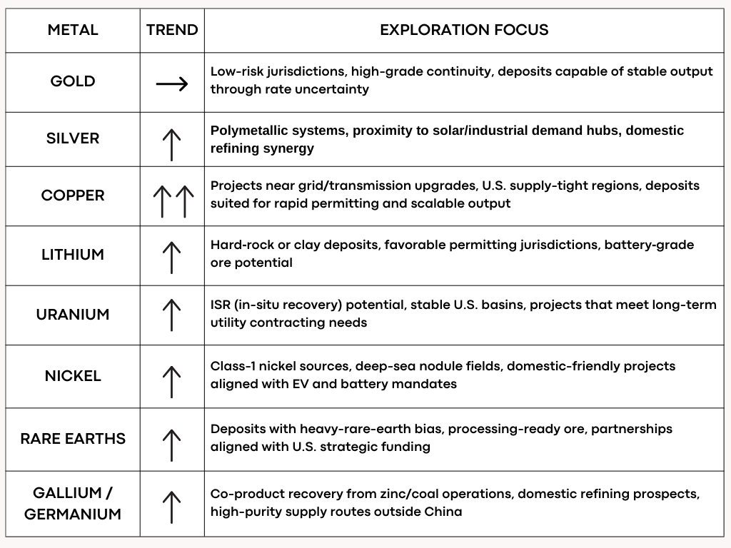 Uranium: Strong policy backing as nuclear rises as a national-security priority; exploration funding and utilities restocking fuel momentum.